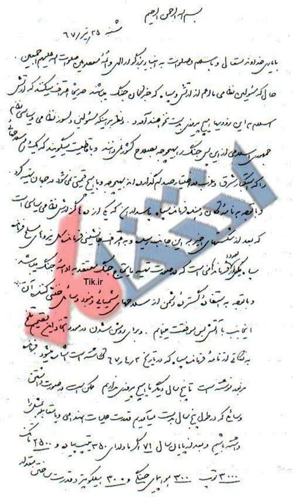 با یاری خداوند متعال و با سلام و صلوات به انبیای بزرگوار الهی و ائمه معصومین صلوات ا... علیهم اجمعین حال که مسئولان نظامی ما اعم از ارتش و سپاه که خبرگان جنگ میباشند، صریحاً اعتراف میکنند که ارتش اسلام به این زودیها هیچ پیروزی به دست نخواهند آورد و نظر به این که مسئولان دلسوز نظامی و سیاسی نظام جمهوری اسلامی از این پس جنگ را به هیچ وجه به صلاح کشور نمیدانند و با قاطعیت میگویند که یک دهم سلاحهایی را که استکبار شرق و غرب در اختیار صدام گذاردهاند به هیچ وجه و با هیچ قیمتی نمیشود در جهان تهیه کرد و با توجه به نامه تکان دهنده فرمانده سپاه پاسداران که یکی از دهها گزارش نظامی سیاسی است که بعد از شکستهای اخیر به اینجانب رسیده و به اعتراف جانشینی فرمانده کل نیروهای مسلح، فرمانده سپاه یکی از معدود فرماندهانی است که در صورت تهیه مایحتاج جنگ معتقد به ادامه جنگ میباشد و با توجه به استفاده گسترده دشمن از سلاحهای شیمیایی و نبود وسایل خنثی کننده آن، اینجانب با آتش بس موافقت مینمایم و برای روشن شدن در مورد اتخاذ این تصمیم تلخ به نکاتی از نامه فرمانده سپاه که در تاریخ 2/4/67 نگاشته است اشاره میشود.