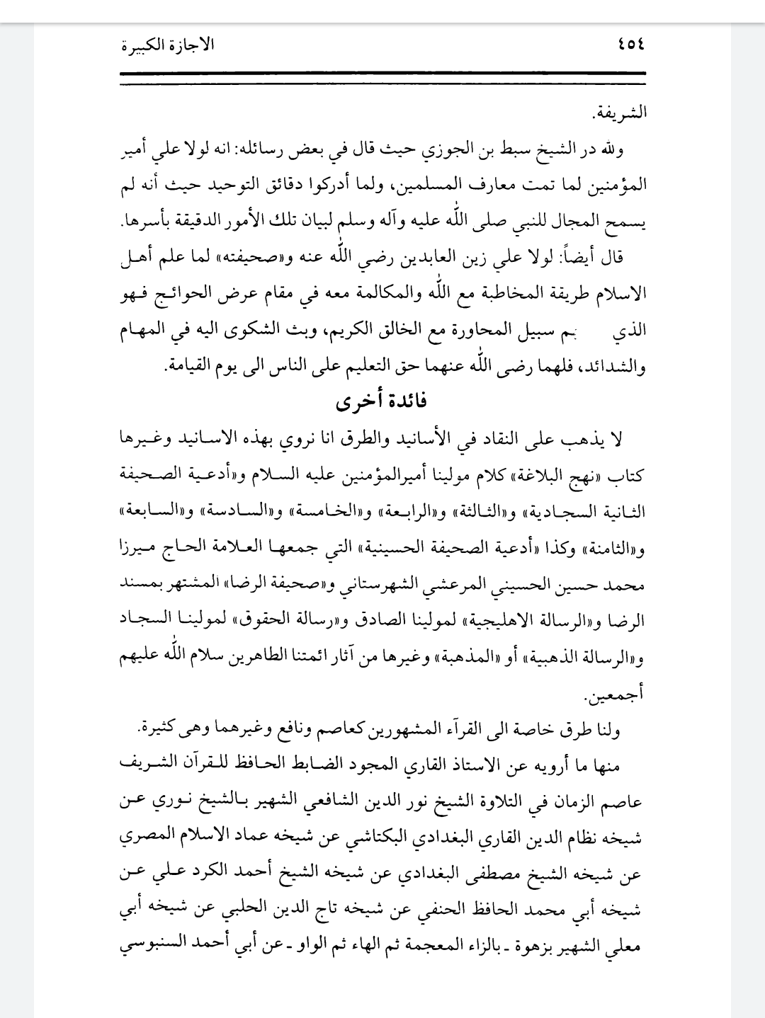 الا يذهب على النقاد في الأسانيد والطرق انا نروي بهذه الأسانيد وغيرها کتاب «نهج البلاغة» كلام مولينا أمیرالمؤمنین علیه السلام و«أدعية الصحيفة الثانية السجادية» و«الثالثة» و«الرابعة والخامسة» و«السادسة» و«السابعة» و«الثامنة» وكذا «أدعية الصحيفة الحسينية التي جمعها العلامة الحاج میرزا محمد حسين الحسيني المرعشي الشهرستاني و «صحيفة الرضا» المشتهر بمسند الرضا والرسالة الأهليجية، لمولينا الصادق ورسالة الحقوق» لمولينا السجاد والرسالة الذهبية» أو «المذهبة» وغيرها من آثار ائمتنا الطاهرين سلام الله عليهم أجمعين.