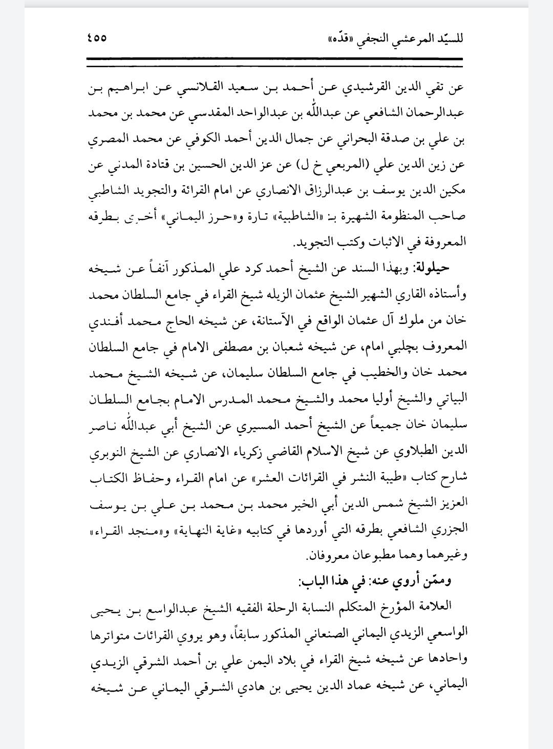العلامة الوالد فخر العترة وجمال الأسرة آية الله السيد شمس الدين محمود الحسيني المرعشي النجفي المتوفى سنة ۱۳۳۸ فانه قدس سره أخذ وروی القرائات وقواعد التجويد عن شيخه العلامة الحاج السيد محمود سلطان القراء بطرقه المذكورة في تأليفه.