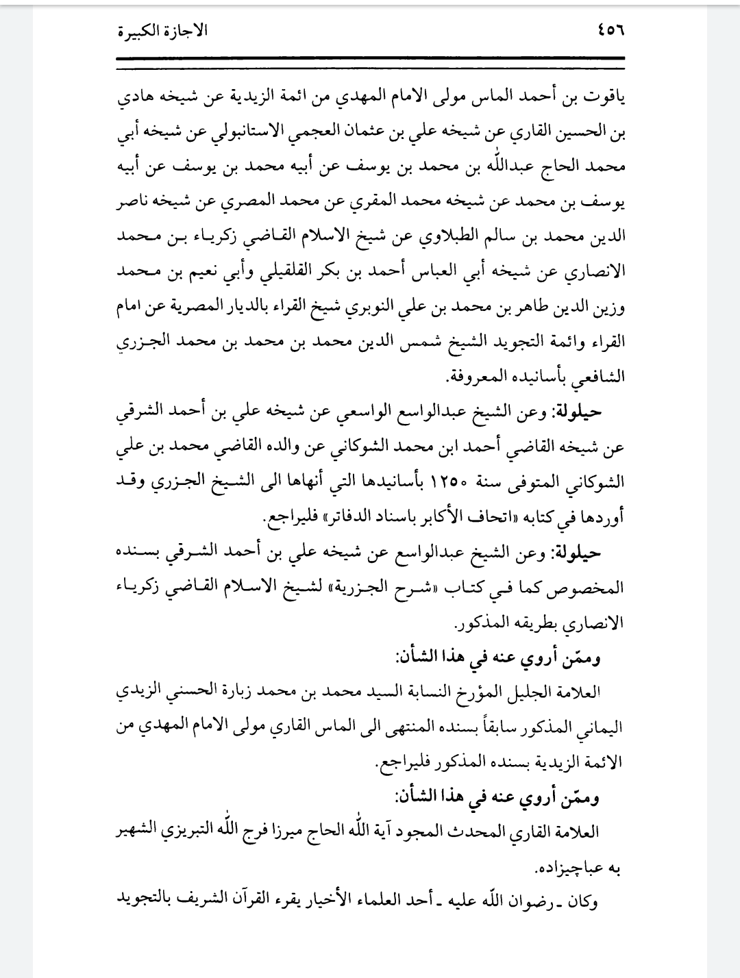 حيلولة: وعن الشيخ عبدالواسع الواسعي عن شيخه علي بن أحمد الشرقي عن شيخه القاضي أحمد ابن محمد الشوكاني عن والده القاضي محمد بن علي الشوكاني المتوفى سنة ۱۲۰۰ بأسانيدها التي أنهاها الى الشيخ الجزري وقد أوردها في كتابه «اتحاف الأكابر باستاد الدفاتر» فليراجع.
