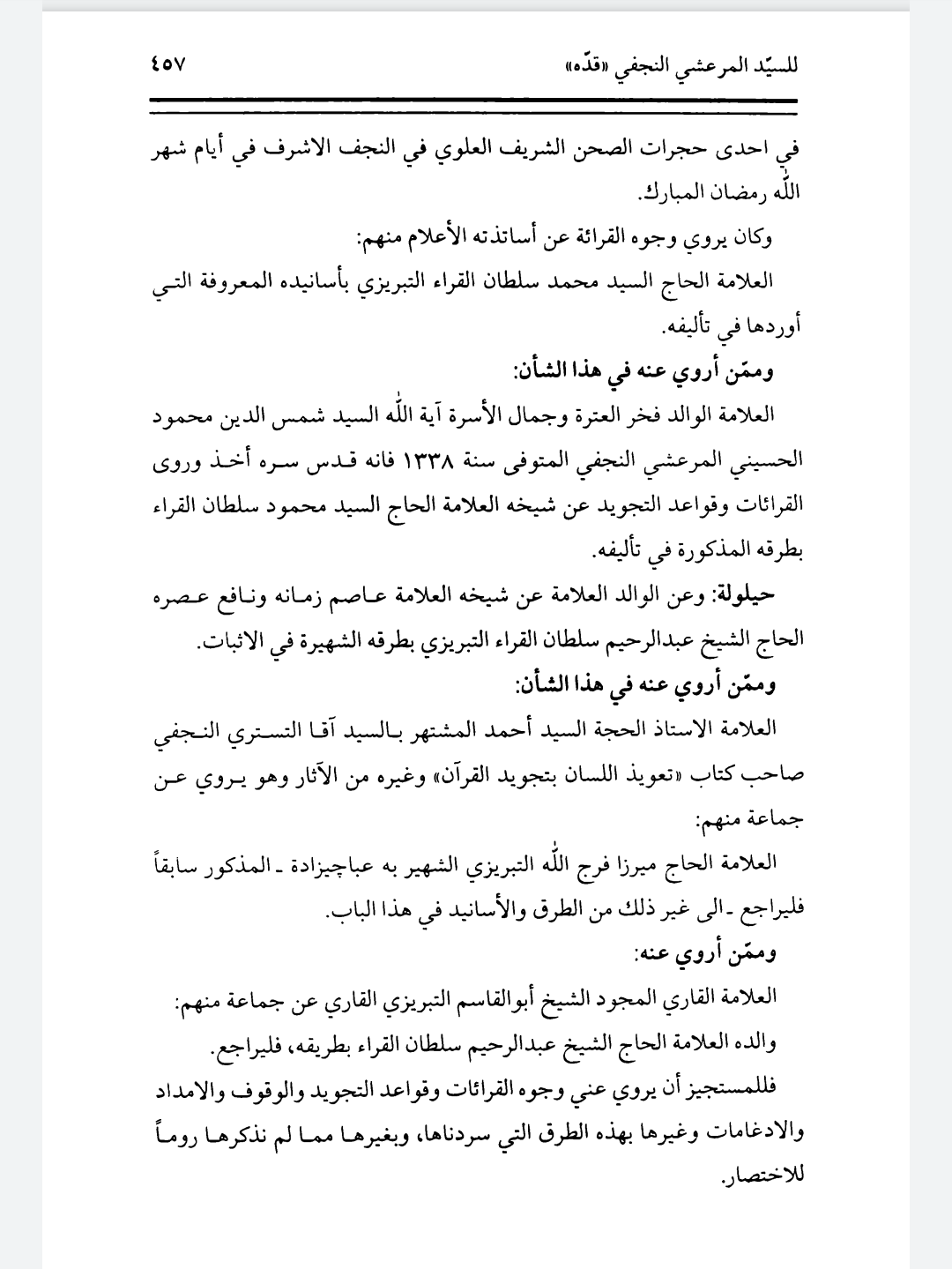 العلامة الحاج السيد محمد سلطان القراء التبريزي بأسانيده المعروفة التي أوردها في تأليفه.