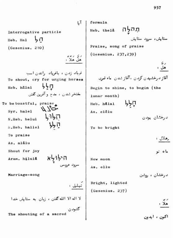فرهنگ تطبيقى- عبرى- هلول، سرياني- هلل- مدح گفتن.
